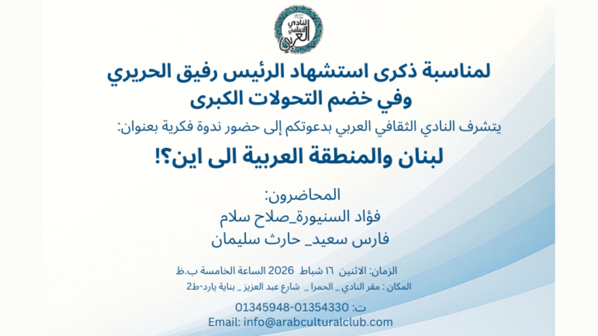 النادي الثقافي العربي يتشرف بدعوتكم إلى حضور ندوة فكرية الاثنين 2026/2/16
