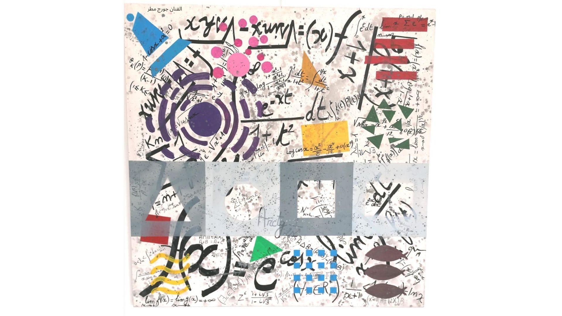 تلك حال هذه اللوحات التي أمامكم. تارة نقرأ فيها قانوناً او معادلة علميّة رياضيّة وطوراً نرى- لا بل نغوص في لونٍ أرجوانيّ أو نتيه في دوائر معلّقة في الفضاء. فلا داعي للذعر او للقلق. جلّ ما ابتغيته هو تجسيد هذا الترابط بين ما هو علميّ وما هو فنيّ. لا ادّعي أنني وفّقت ولكنني ارتضيت عناء المحاولة. محاولة الخروج من المحسوس والزمان. فهل هذه المعادلات هي أقفاص اللون، أم اللون سجّانها؟ ام العكس؟ ومن يقرأ مزاميره على من؟ هل للعلم سلطان على الفن أم العكس؟ من هو العصفور السجين وما هو القفص؟ من يحوي من؟ هل العلم حرّ طليق ام الفنّ؟ ومن طريقه أقرب الى الله؟ عرفت أن هناك سباقاً بين الاثنين في داخليّ، ويا لسعادتي ولحسن طالعي فأنا الرابح في الحالتين.