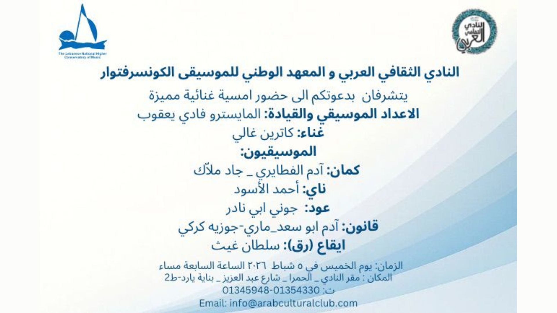 النادي الثقافي العربي و المعهد الوطني للموسيقى الكونسرفتوار يتشرفان بدعوتكم الى حضور امسية غنائية مميزة الخميس ٢٠٢٦/٢/٥
